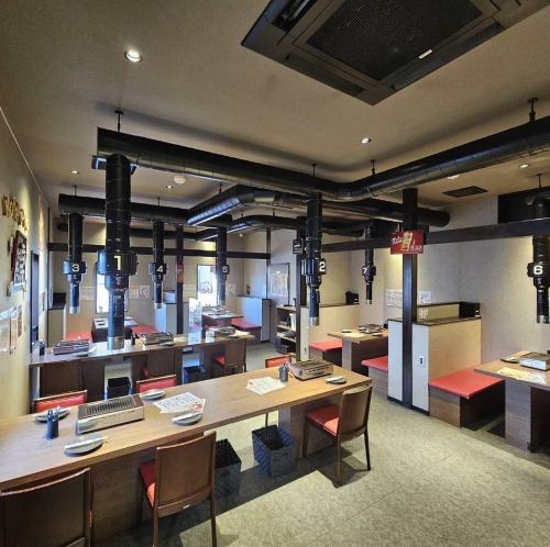 木目調のテーブルと清潔感のある内装が調和した、モダンで落ち着いた雰囲気の焼肉店です。各席には強力な排気ダクトと専用ロースターが完備されており、煙や匂いを気にせず快適に食事を楽しめます。